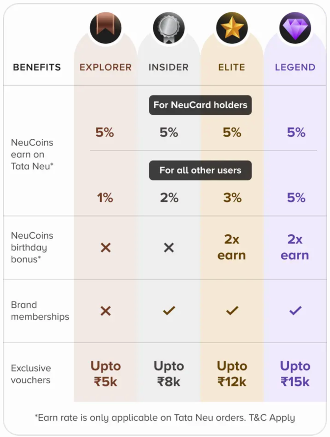 During your birthday month, Tata Neu offers 2× NeuCoins to the Elite and Legend tier members, capped at 200 extra NeuCoins.